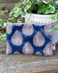 - Velvet Embroidered Palm Leaf Coin Purse - Denim Blue