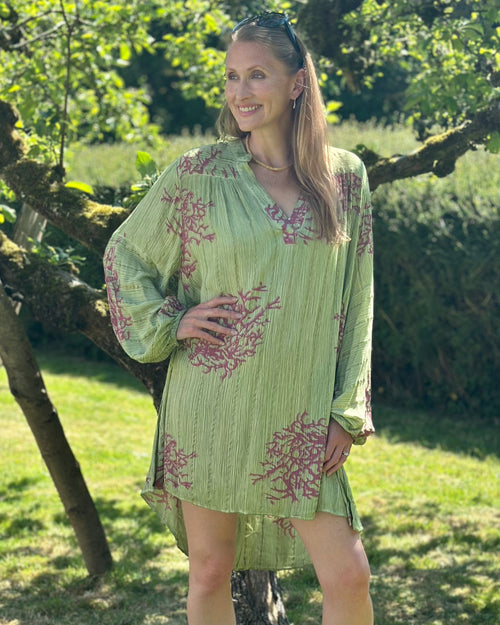 A lovely stylish summer dress with coral pattern on a green background with gold lurex in vertical stripes throughout. A grandad style collar with open neck, long blouson sleeves and a dipped rounded hemline finishing around the knees and longer at the back. Keep cool during the summer with this beautiful garment. Simply wear on its own or dress with skinny jeans and flats for cooler times.