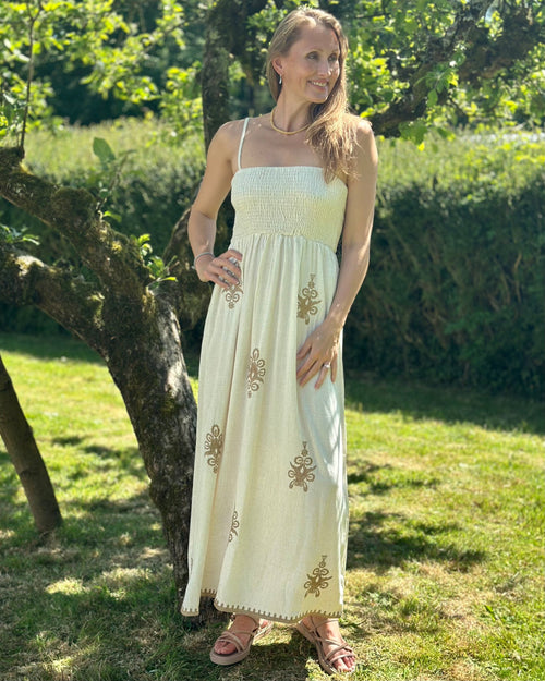 This stunning embroidered sundress is a perfect garment for the warmer weather! Lovely cream linen mix. The dress haas a shirred bodice, long flowing skirt and adjustable spaghetti straps. Wear with your favourite sandals, flip flops or dress it up with some summery flats and a jacket in the evening. You could even layer a fitted t-shirt underneath for cooler days.