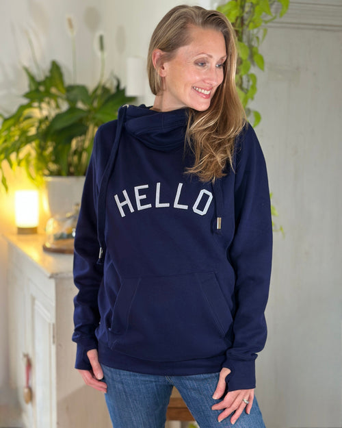 This super soft stylish hoodie is the ultimate luxurious sweatshirt with 'HELLO' embossed across the front, a large pocket and large hood with drawstrings. A lovely warm fluffy lining. The long arms finish in a soft ribbed cuff with finger hole - allowing you to keep hands warm and the sleeves from rolling up!
