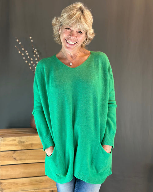 A super soft knit baggy jumper with 2 handy pockets on the front, a lovely gentle round neckline and a ribbed hemline. Warm and cosy with a smart casual look. The sleeves are slightly bat winged and semi fitted. These pocket jumpers are slightly shorter than the other 'slouchy pocket jumpers' which are approx 80cms long.