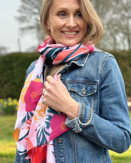 This is a beautiful delicate soft silky scarf in a gorgeous red daisy mix. Made from 100% recycled polyester. A gorgeous colour for the spring/summer months.