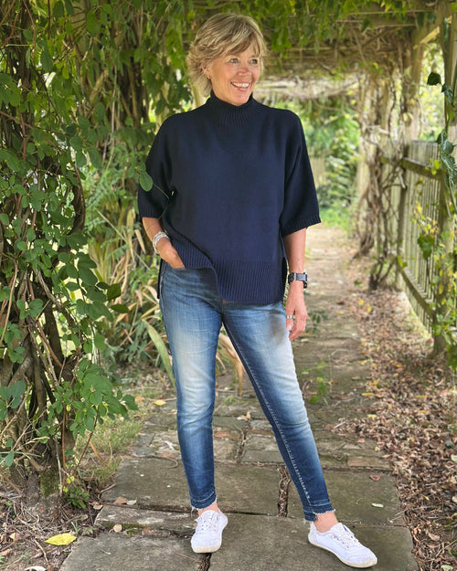 This jumper is so super soft and stylish with its large ribbed high neck and ribbed elbow length sleeves. This style is more relaxed with a deep ribbed hem, side slits and slightly dipped at the back. A gorgeous comfortable fit - Perfect worn with jeans or one of our satin skirts.