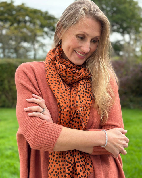A gorgeous soft drape printed scarf in orange with black polka dots. These are a new range of products made with viscose derived from bamboo, so they are eco-friendly. A beautiful accessory for autumn which coordinates with our Sienna faux suede gloves.