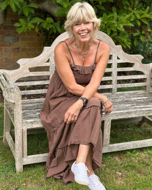 A beautifully cool strappy summer dress - Perfect for the holidays! It has a lovely long tiered skirt flowing down form the ruched bodice. A small frill on the bodice and spaghetti straps.