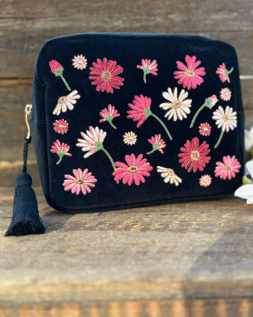 A pure feel of luxury - This beautiful velvet wash bag or cosmetics bag has on the front stunning embroidered wildflowers with a luxurious long silky tassel attached to the gold zip. Inside there are 4 separate side pockets and a waterproof lining. Perfect for travel - large enough for everything!